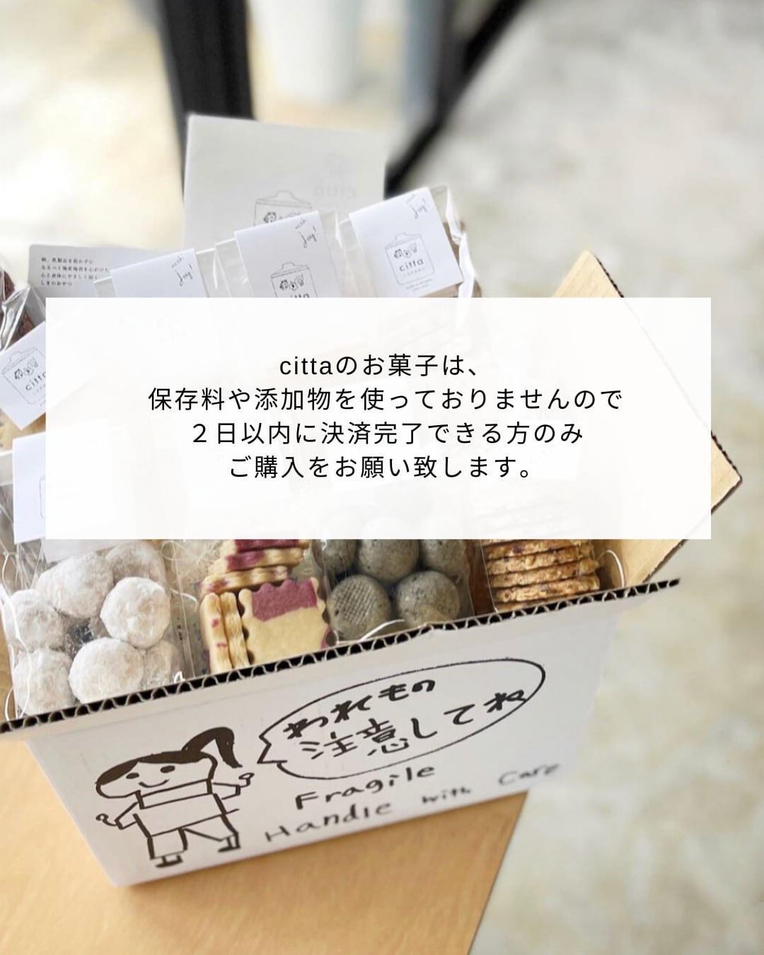 cittaの焼き菓子は、保存料や添加物を使っておりませんので賞味期限は長くありません。