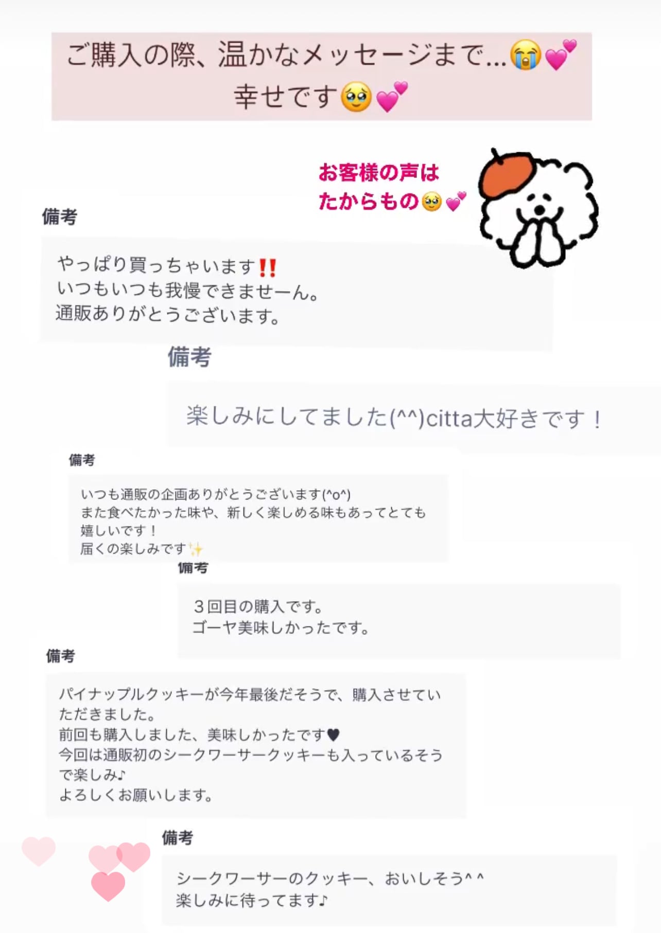 cittaしまのおやつのお菓子は、卵や乳製品は使っておりませんが、原材料製造工場では様々な食材を共通の設備で製造している場合もあるため、原材料に使用していないアレルギー物質が製造過程で付着・混入する可能性もあります。